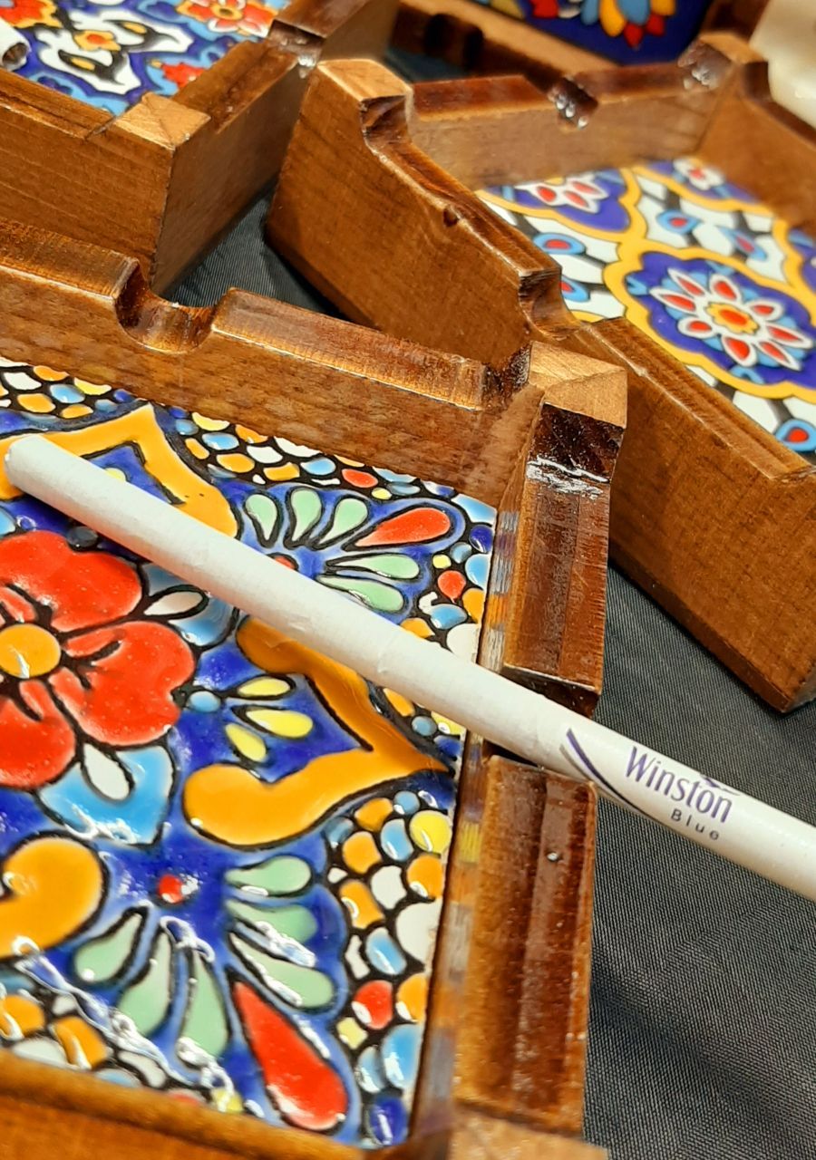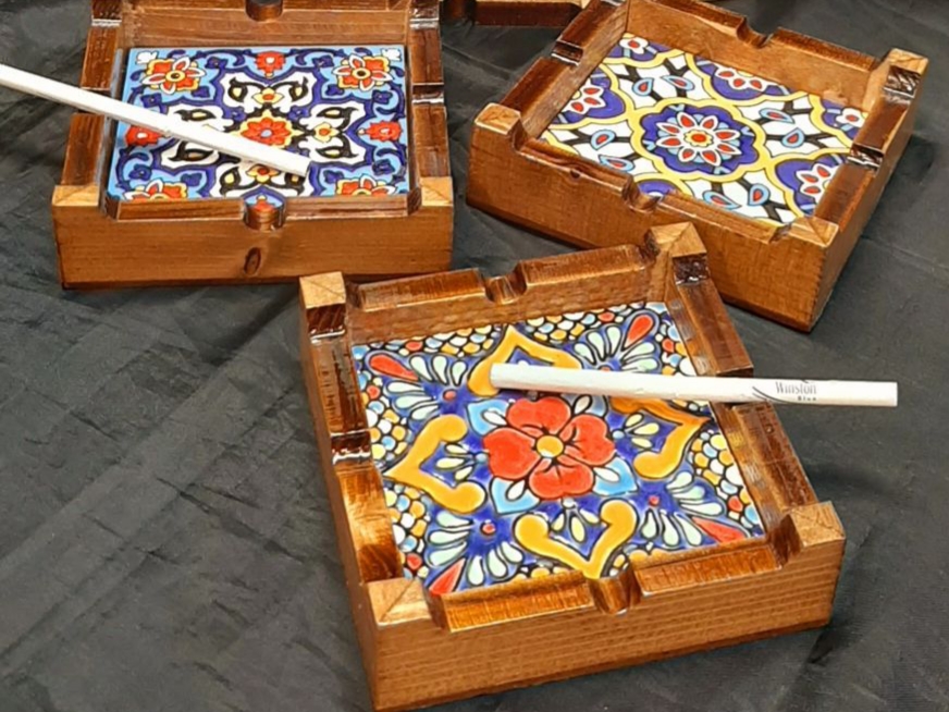 زیرسیگاری چوب و کاشی جنس چوب و کفه کاشی اندازه ۱۰ × ۱۰ س اندازه کاشی ۸ × ۸ س در طرحهای کاشی های سنتی و اصیل ایرانی قابل شستشو جعبه ندارد