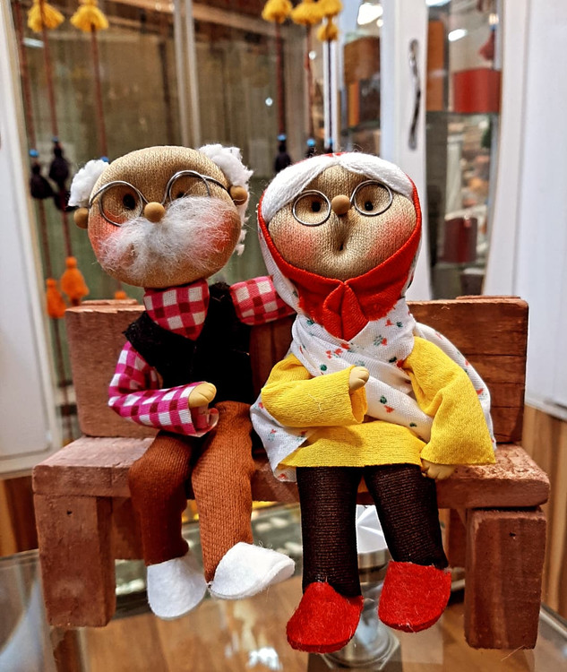 عروسک پدربزرگ و مادربزرگ نشسته نیمکت دکوری / پدر بزرگ / مادر بزرگ / بابابزرگ و مامان بزرگ