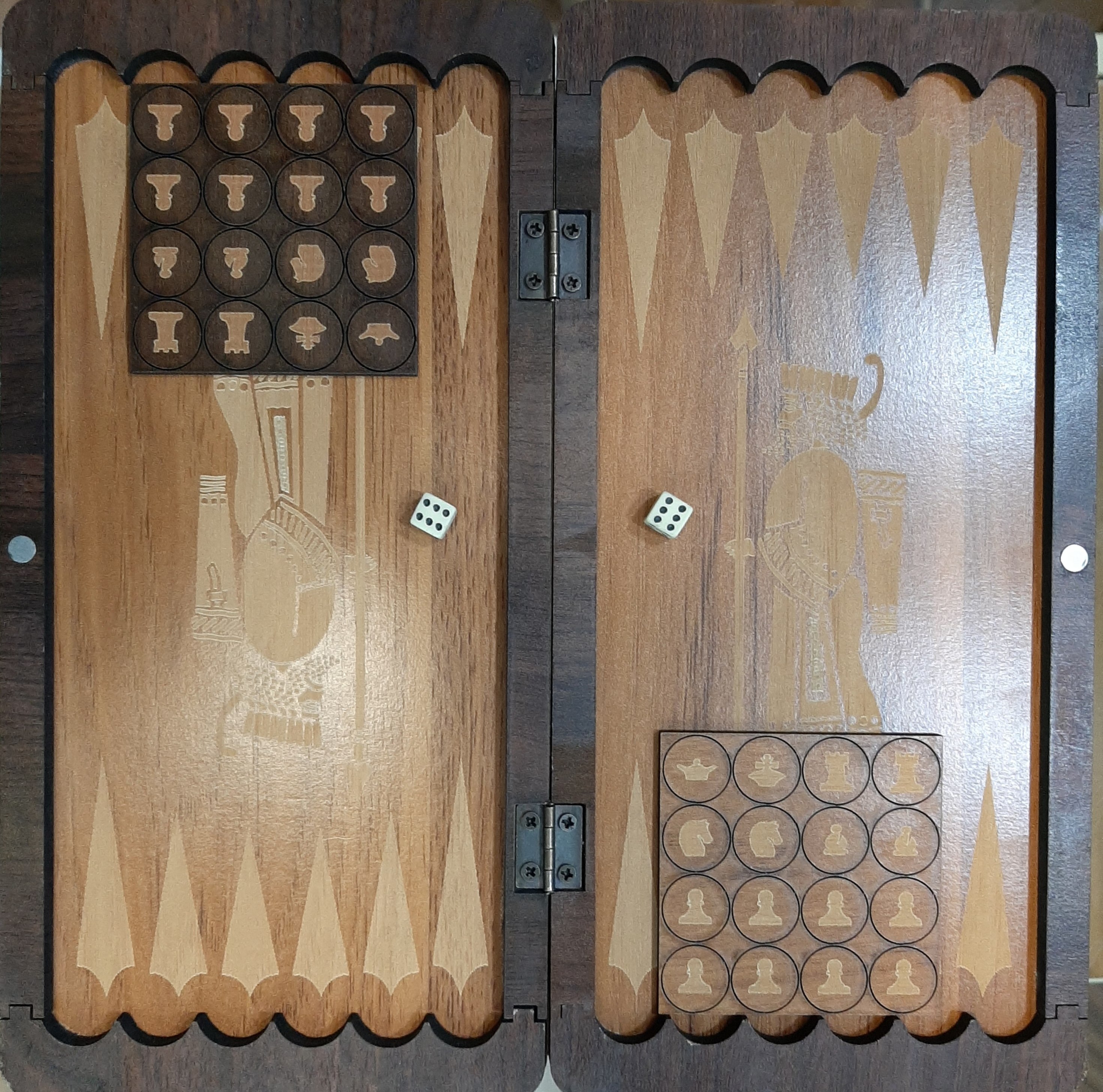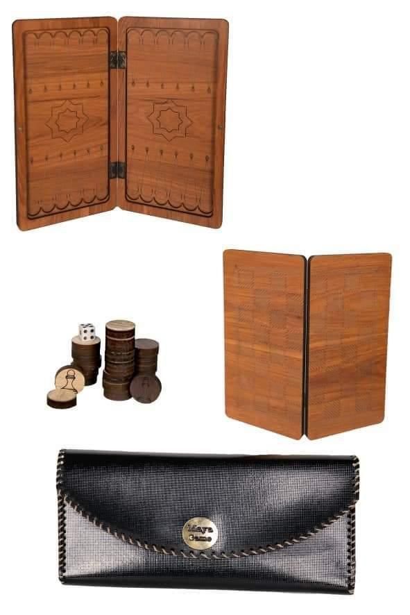 شطرنج و تخته نرد مسافرتی چوبی جنس ام دی اف دارای کیف دارای مهره های شطرنج و تخته نرد دارای ۲ تاس دارای قفل آهنربایی اندازه ۲×۱۵×۲۵
