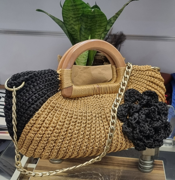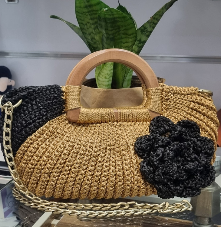 کیف مجلسی مکرومه دست بافت دسته چوبی / کیف دست بافت / کیف زنانه بافت / کیف بافت / کیف مکرومه