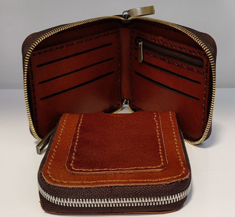 کیف پول دور زیپ دست دوز چرم طبیعی گاو
